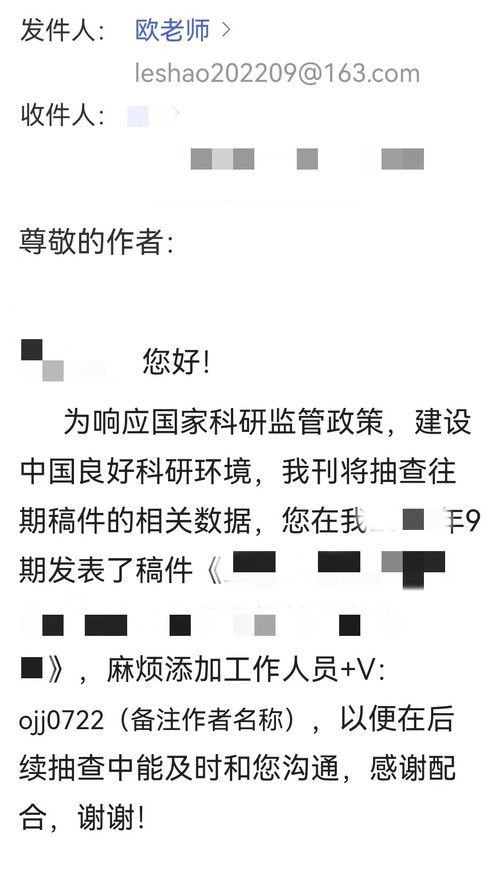 近日,有多位作者向编辑部反映,收到内容 “为响应国家科研监管政策,建设中国良好科研环境,我刊将抽查往期发表的论文数据……”的群发邮件(见下图),落款为《中华行为医学与脑科学杂志》。经核实,本刊编辑部未向任何人发送此类信息的邮件,是有不良企图之人冒充编辑部发送的邮件。请广大作者提高警惕,避免造成不必要的损失。本刊编辑部保留对发件人追究法律责任的权利。
