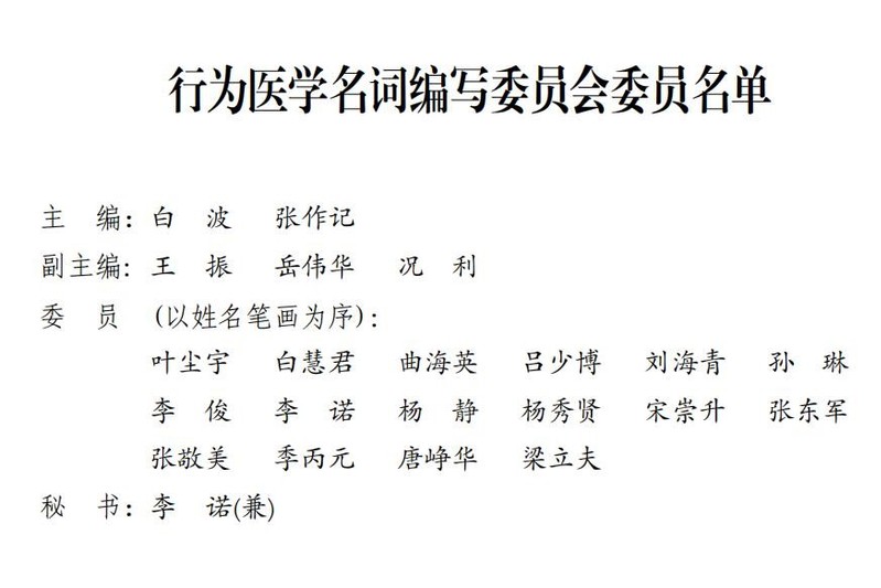 2019年初,中华医学会受全国科学技术名词审定委员会委托,组建医学名词审定委员会行为医学名词审定分委员会,在专家委员会的共同努力下,历时近3年,于2021年9月形成行为医学名词征求意见稿,在全国科学技术名词审定委员会网站及有关媒体面向全社会公开征求意见。根据反馈意见,医学名词审定委员会行为医学名词审定分委员会进一步修订完善,上报全国科学技术名词审定委员会批准公布。