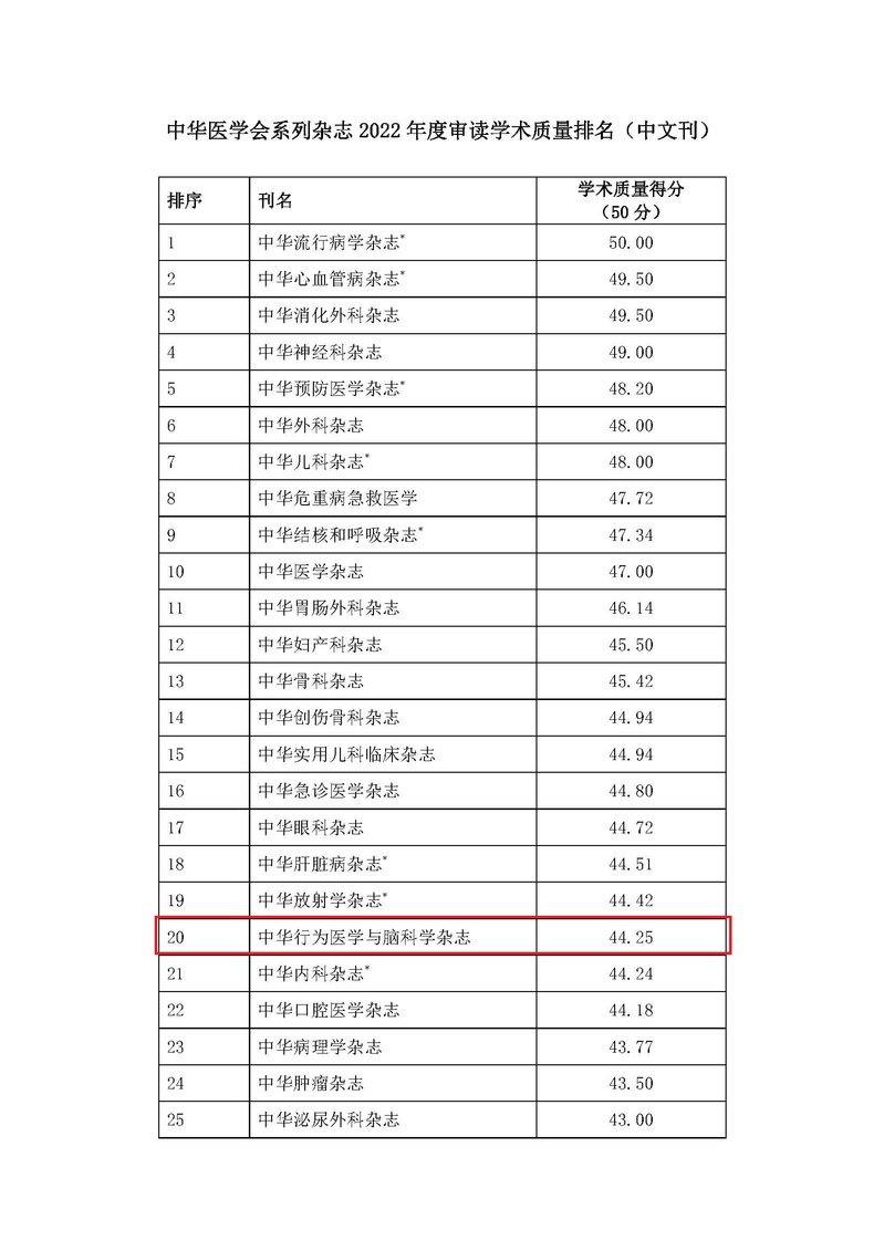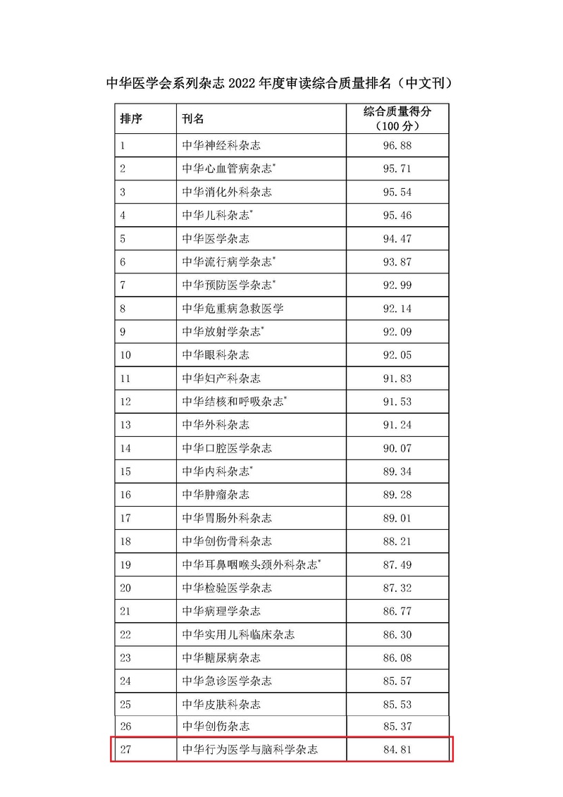 近日,中华医学会发布2022年度系列杂志综合质量评审报告,《中华行为医学与脑科学杂志》学术质量排名第20位,综合质量排名第27位。