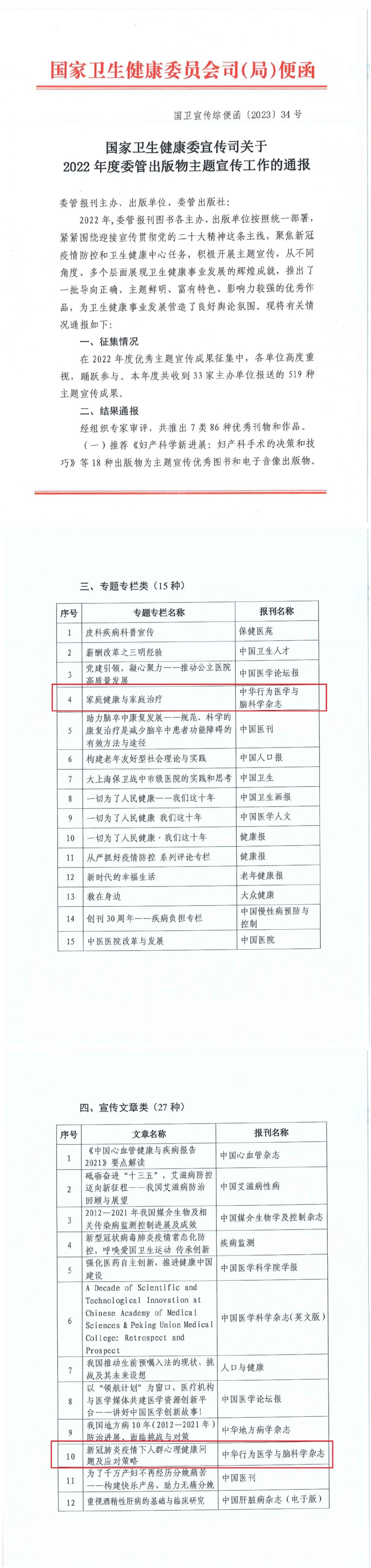 此次评选由国家卫生健康委宣传司组织专家对33家主办单位报送的519种的主题宣传成果进行评审,最终评选优秀图书电子音像出版物、优秀报刊、优秀专题专栏、优秀宣传文章等七类116种优秀刊物和作品。《中华行为医学与脑科学杂志》策划的“家庭健康与家庭治疗”专题荣获主题宣传优秀专题专栏,发表的《新冠肺炎疫情下人群心理健康问题及应对策略》荣获主题宣传优秀作品。