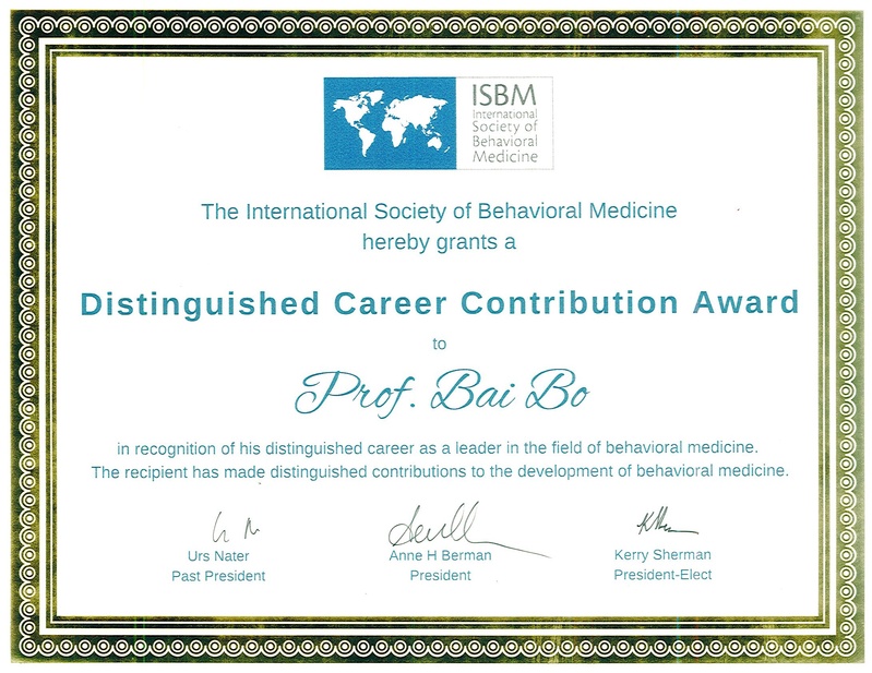 鉴于白波教授在行为医学领域做出的杰出贡献,国际行为医学会特授予他“国际行为医学杰出职业贡献奖”。中国行为医学的蓬勃发展已在国际社会受到日益广泛的关注,白波教授对推动以“行为决定健康”的科学理念和大众教育做出巨大贡献,国际行为医学会以拥有白波教授及中国行为医学团队为荣。